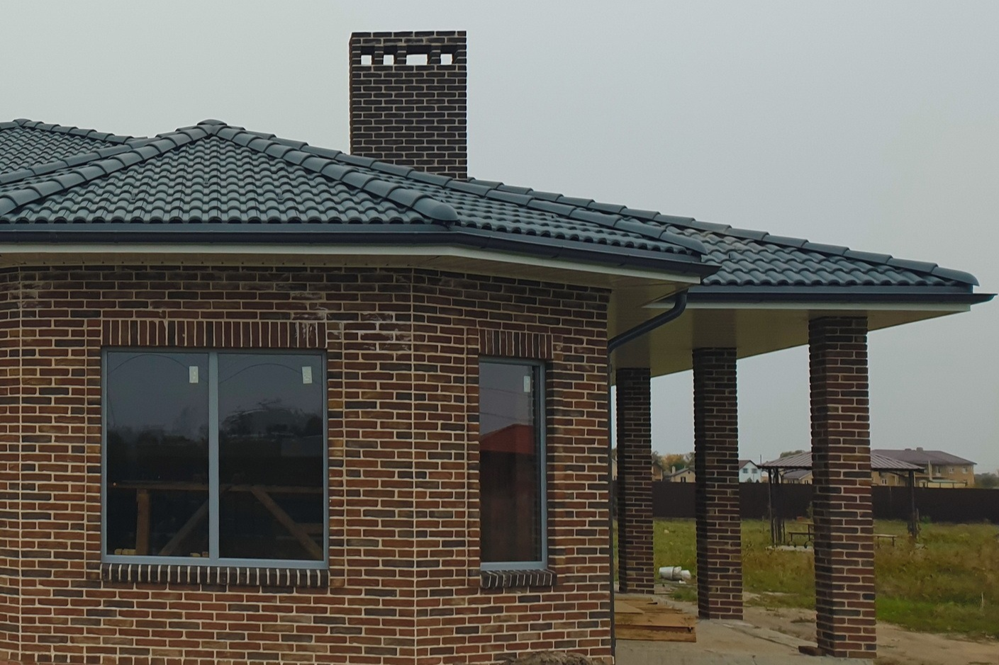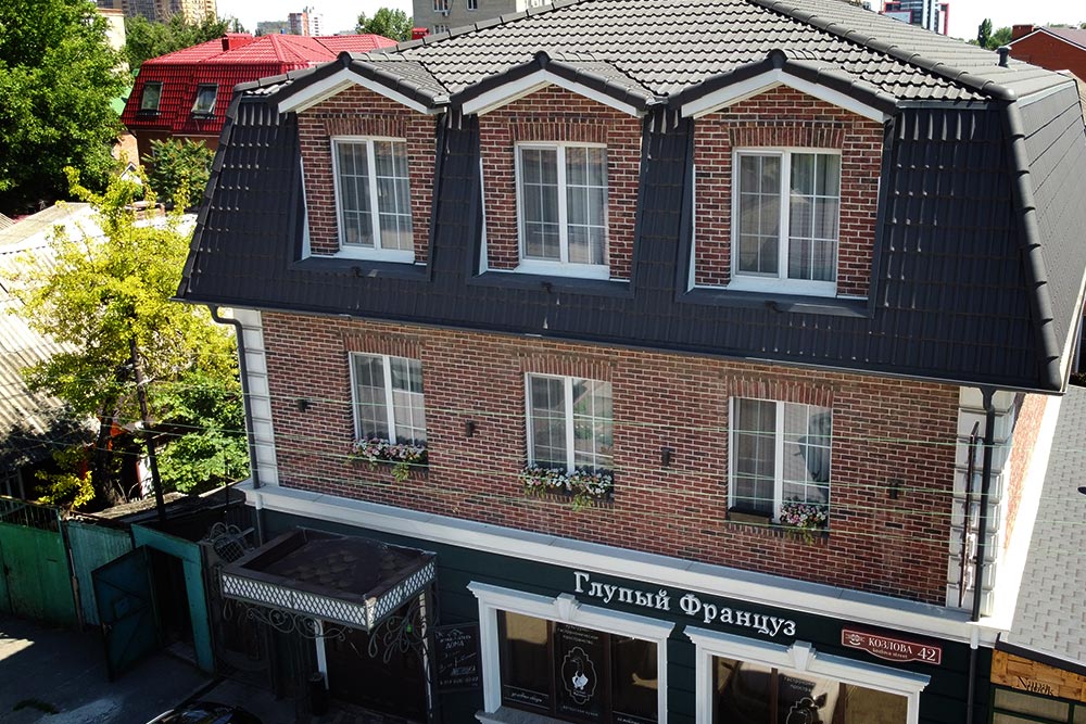 Этот дом во всех смыслах уникален не только для Ростова, но и для наших широт в целом. Очень сложная, но крайне красивая архитектура, комбинация в фасаде кирпича ручной формовки, натурального камня и клинкерной плитки, а самое важное — сланцевая кровля высокой сложности. Плюс грамотное оформление прилегающей территории с легким на вид кованым забором и брусчаткой из натурального камня. Посмотрите сами, и у вас тоже возникнет ощущение, что вы оказались в фешенебельном квартале на побережье Средиземного моря, а не в центре Ростова-на-Дону. Кстати, это уже пятая сланцевая кровля, смонтированная нашей компанией. А таким опытом не может похвастаться ни один другой застройщик.